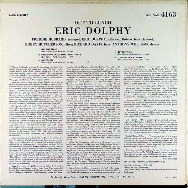 Out to Lunch! was Eric Dolphy´s only recording for Blue Note Records as a leader and was originally issued as BLP 4163 and BST 84163. Today it is generally considered one of the finest albums in the label’s history, as well as one of the high points in 1960s jazz avant garde and in Dolphy’s discography. [source]